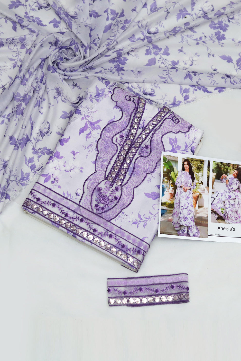 Embrace timeless elegance with this Maria B-inspired unstitched lawn suit, featuring cut work-style embroidery, rich digital prints, and a luxurious Swiss Voile dupatta.